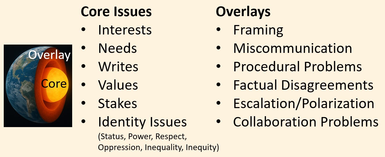 These terms overlay and core are based on a geological metaphor, looking at the core of the earth and the rock layers on top of the core, which geologists call "the overlay." The core of the earth is small, deep, and very hot, just as the core of intractable conflicts is often very deep-rooted and very "hot." Though the conflict core is not necessarily small—it can be about very big and important issues (the parties' interests and needs, rights, moral beliefs and values, identity, security, and what we call "high stakes distributional issues"), it is not nearly as big as it gets when the many "overlay factors" get added on top of it. Those overlay factors are all the "stuff" that gets piled on top of the core that obscures the core conflict so much that sometimes you can't see it at all. (Examples, which we'll talk about more below, include misunderstandings, factual disputes, procedural problems, escalation, polarization and other "complicating" factors.