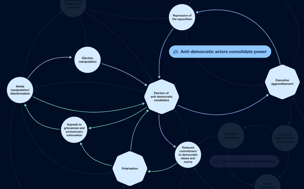 Democratic erosion is the incremental and multifaceted deterioration in the freedoms, guarantees, and processes vital to the functioning of democracy. Various studies have tried to pinpoint one cause or set of causes of democratic erosion. But we argue that democratic erosion is a systems problem that is best understood by applying systems thinking to identify and explore the complex processes and pathways behind the phenomenon. This interactive feature [the conflict map] illustrates those dynamics and uses systems mapping to show how reinforcing “loops” — the circular chains of cause and effect — accelerate democratic erosion.