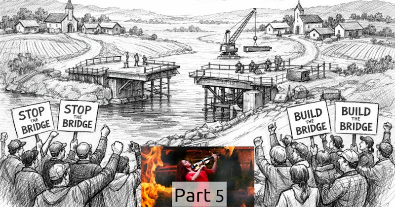 This is the second part of our continuing response to David Beckemeyer, Kristin Hansen and Pearce Godwin’s discussion of what we call “Fiddling While Rome Burns,” and Kristin succinctly calls “fight or bridge”? In our first post, we included a link to David’s original essay “What Bridge Building Owes Democracy“ and our response to it, which took three newsletters this, this, and this.) We also included Kristin and Pearce’s response to both David and us, and a link to David’s second newsletter replying to all of us: The Bridge, the Arena, and the Referee: A Response to Guy and Heidi Burgess and Pearce Godwin