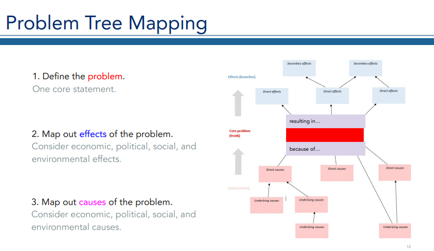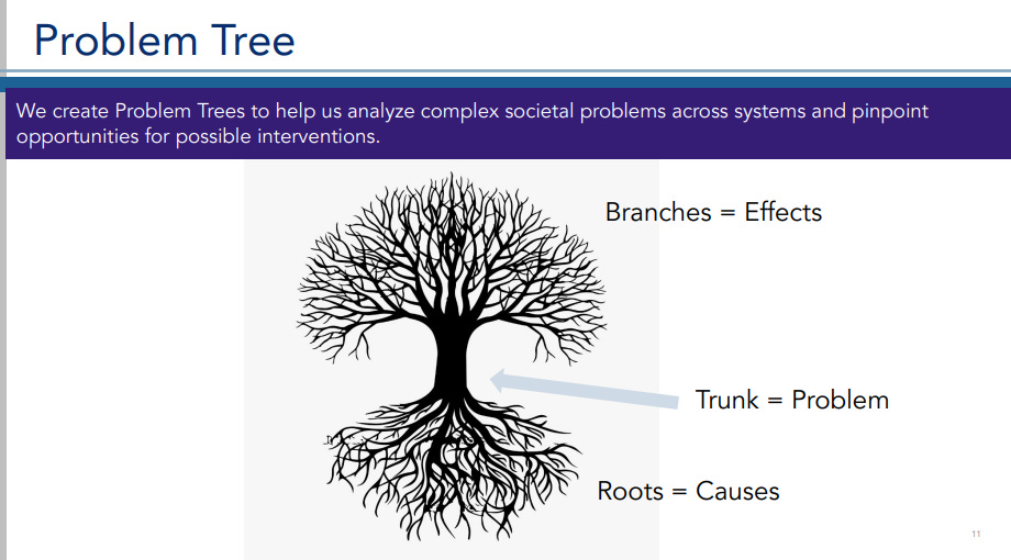 His map is based on his "Problem Tree." The trunk is the problem, which he tells his audience needs to be defined in one core statement. The branches are the effects of the problem—why is it a concern? And the roots are the causes of the problem. For both the effects and the causes, he advises considering economic, political, social, and environmental causes and effects. On his map, just like the tree, the effects go on top of the problem, and the causes go on the bottom. Clean and simple. Easy to draw. Easy to read.
